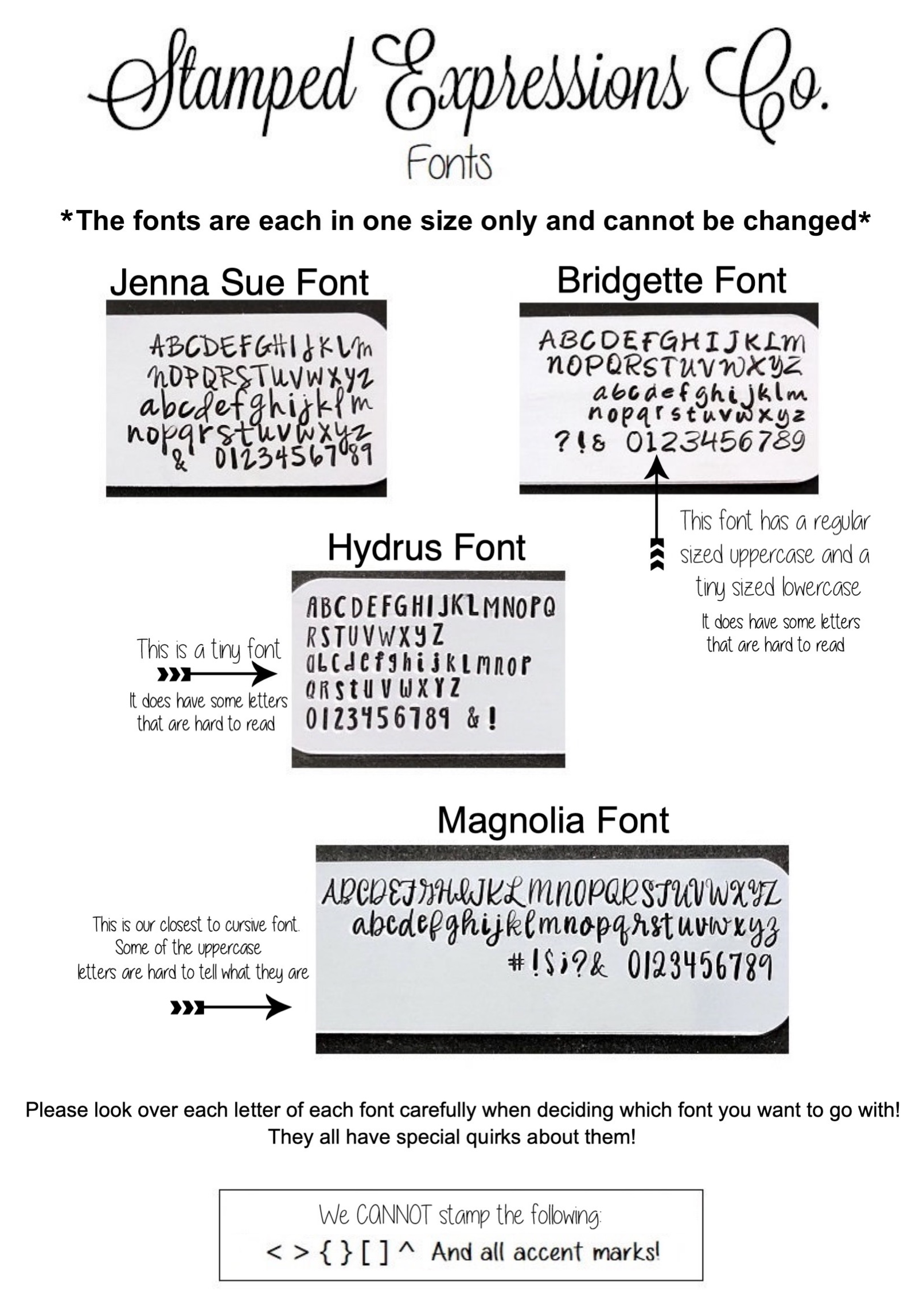 ·Please remember that we hand stamp each tag so there may be some slight variations. Sometimes not all letters and/or numbers will be perfectly aligned as this is the nature of hand stamping. This adds character and uniqueness to your items. We do try our best though to achieve that perfect and straight look :)