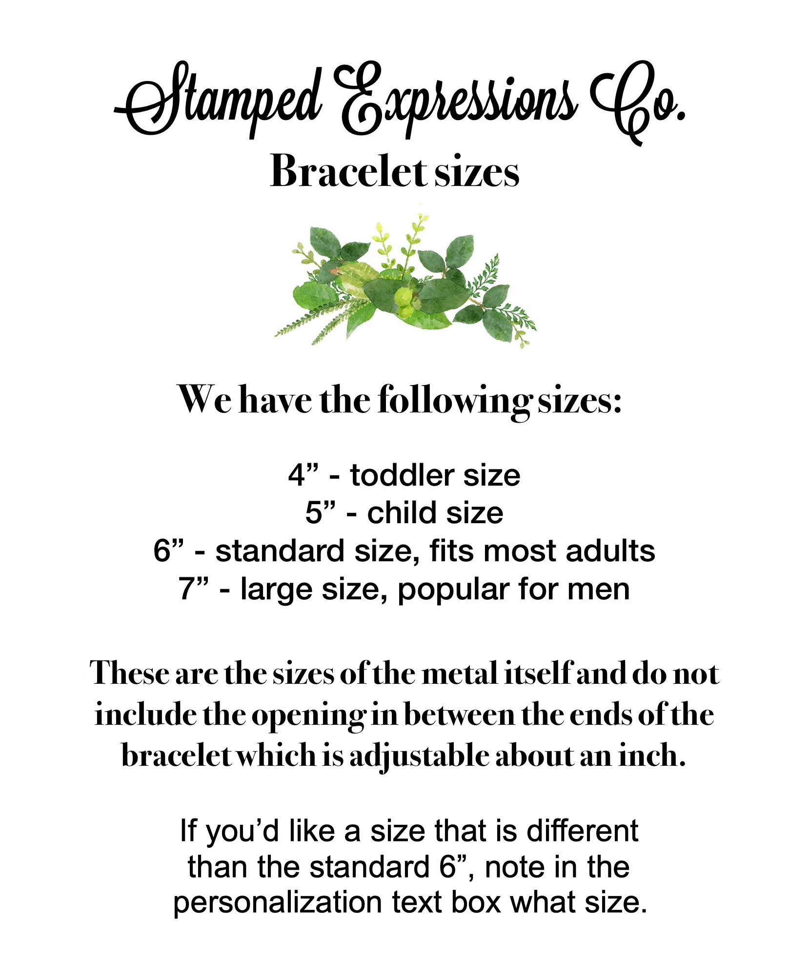 ➜ We hand stamp each item so there may be some slight variations and light marring on the back of the item from the stamping. At times, some words may not measure exactly centered on the item. Also sometimes not all letters, numbers and designs will be perfectly aligned or stamped the same depth as each other as this is the nature of hand stamping. This adds character and uniqueness to your items. We do try our best though to achieve that perfect and straight look :)