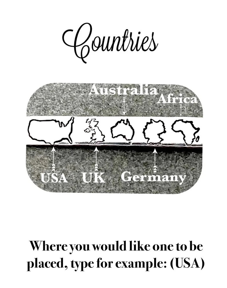 •Where you would like a design to be placed type for example (heart), (Florida), etc.