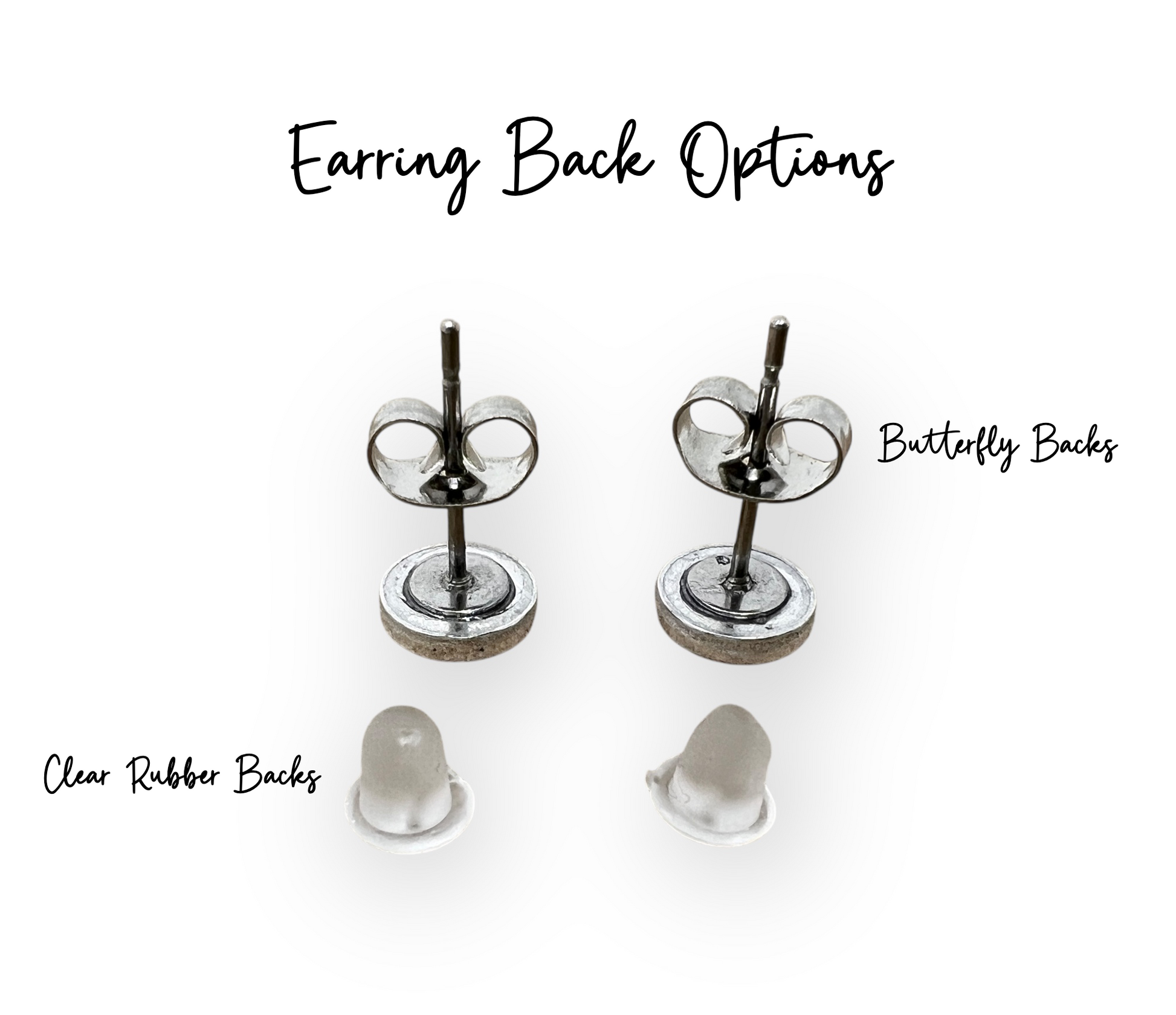 • Each of the aluminum discs come attached to stainless steel earring posts that have your choice of clear rubber backs or stainless steel butterfly backs.