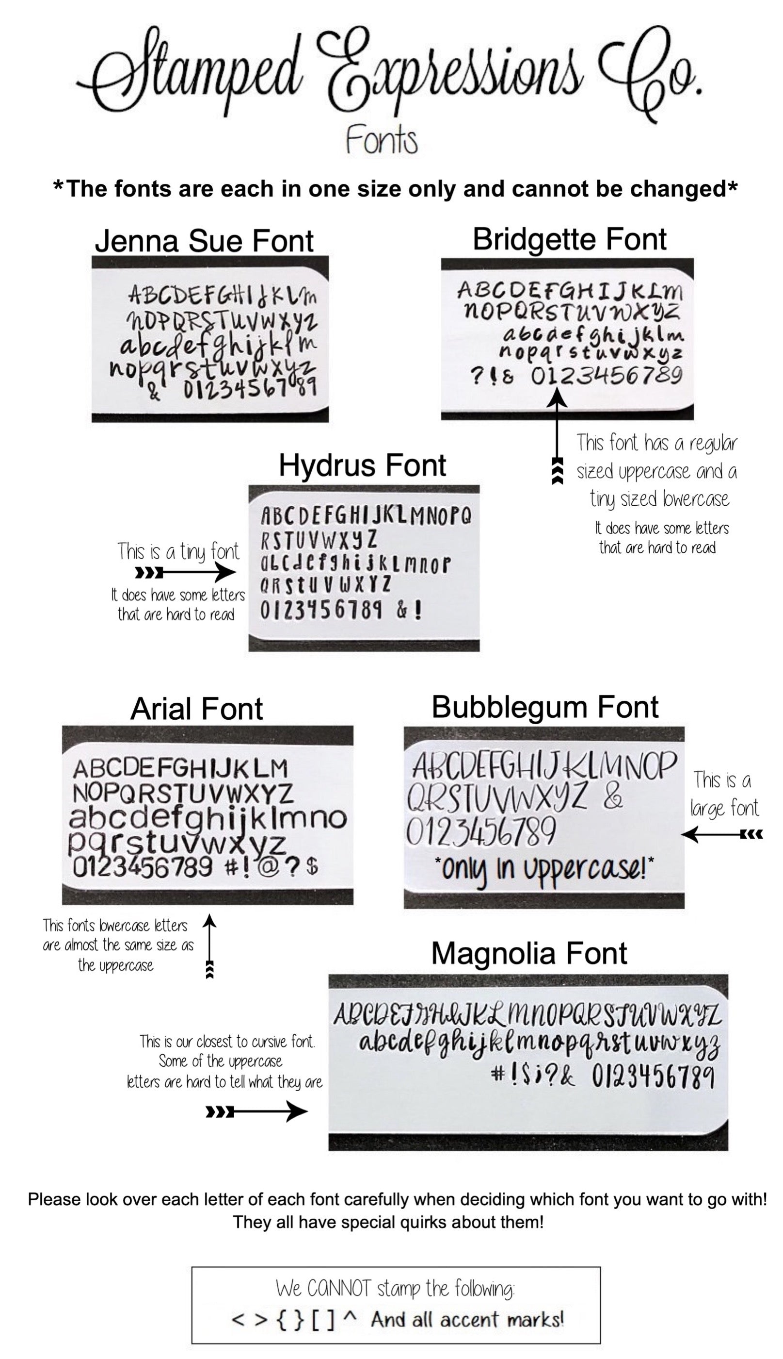 •Please remember that we hand stamp each item so there may be some slight variations and light marring on the back of the item from the stamping. At times, some words may not measure exactly centered on the item. Also sometimes not all letters, numbers and designs will be perfectly aligned or stamped the same depth as each other as this is the nature of hand stamping. This adds character and uniqueness to your items. We do try our best though to achieve that perfect and straight look :)