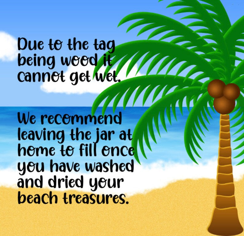 •The tag is made of wood printed with a beach shore scene and engraved