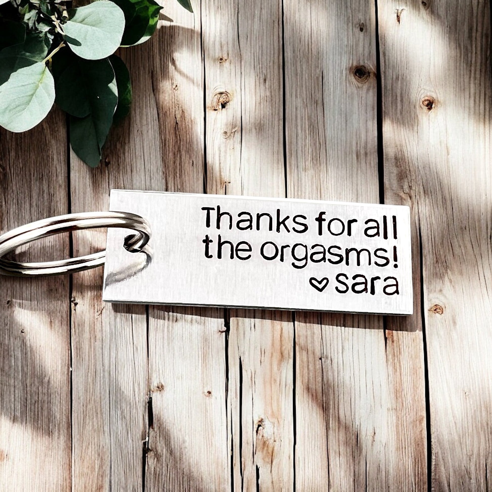 The keychain features the phrase “Thanks for all the orgasms” adding a fun and playful sentiment to express commitment with a smile. Personalize it with an initial or name to create a thoughtful, customized gift for someone special.