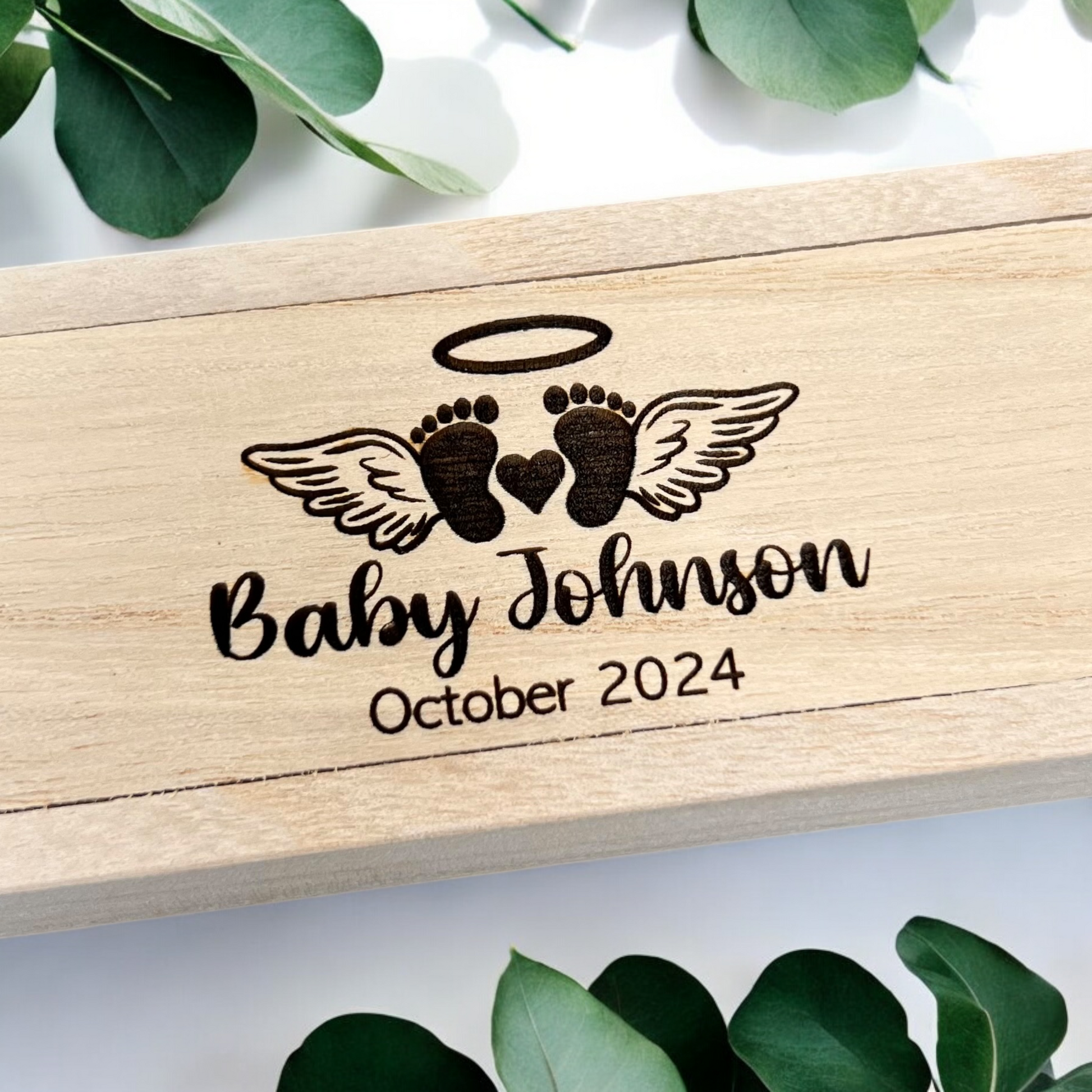 This wooden keepsake box is personalized with a name and year. The design includes two baby footprints with angel wings and a halo, symbolizing an angel baby. The light wood grain gives it a natural, rustic appearance, while the engraved details add a sentimental touch.