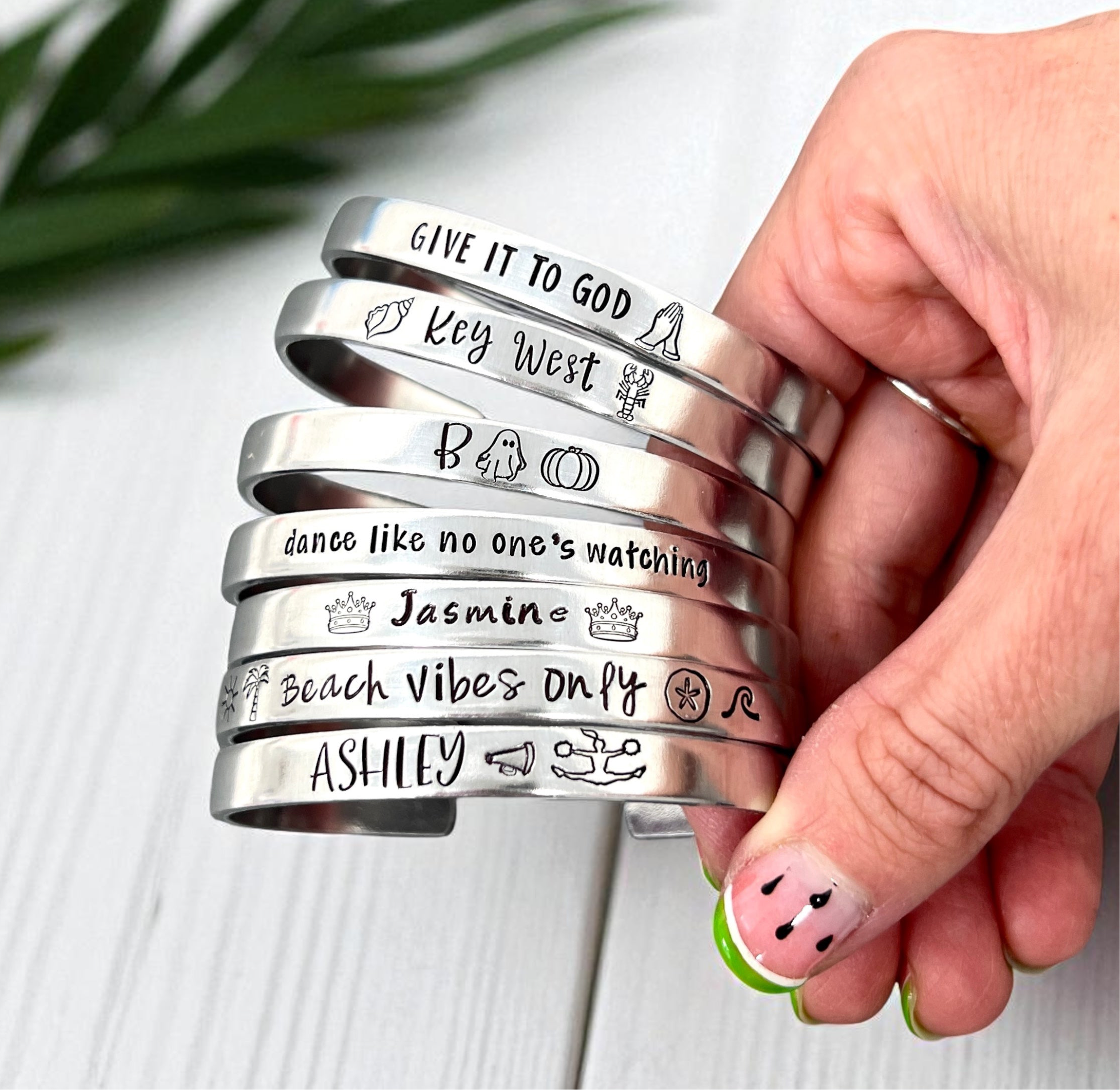 They are laser engraved/cut or hand stamped in our studio in Cape Coral, Florida. Thank you for supporting a small business.